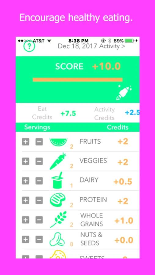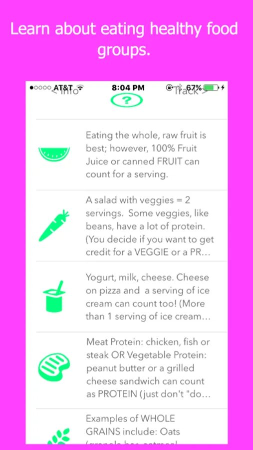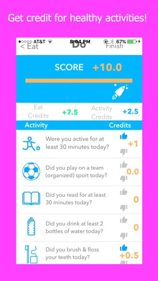 Earn credits when you eat healthy foods, like FRUITS, VEGGIES & WHOLE GRAINS! If you don't know what a WHOLE GRAIN is, the app teaches you by giving examples (granola bar, oatmeal, wheat bread...). You also earn credits for doing healthy activities like BEING ACTIVE, READING and GETTING ENOUGH SLEEP!
