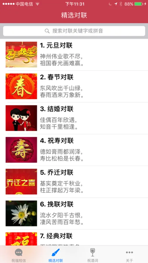 - 对联类别包括:元旦对联、春节对联、结婚对联、祝寿对联、乔迁对联、挽联对联、经典对联、元宵节对联、端午节对联等。