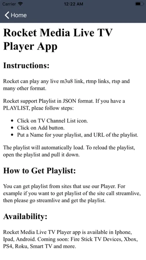 Enter your HLS or RTMP live TV links to play, or load the list of links using Playlist Manager. Currently support json playlist format.