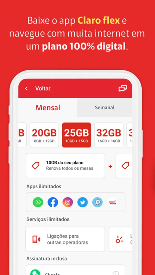 Planos com Whatsapp, Instagram, Facebook, Twitter, Waze e Claro música ilimitados;