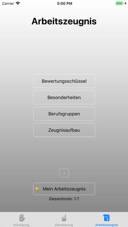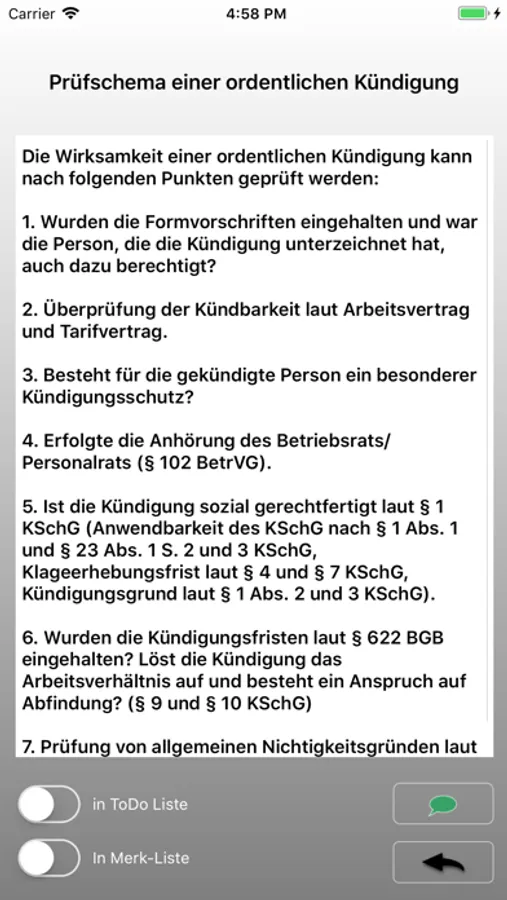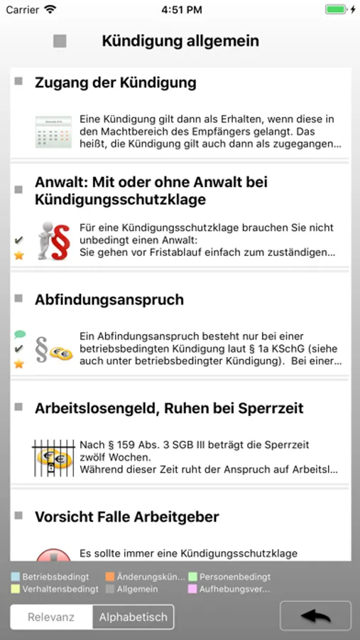 Alles was Sie als Arbeitnehmer, Betriebsrat oder Personalrat zu Kündigung, Abmahnung oder Arbeitszeugnis wissen sollten. Diese App beinhaltet nicht nur detailliertes und umfangreiches Wissen zu den verschiedenen Formen einer Kündigung bzw. Abmahnung, sondern auch klar strukturierte Anleitungen, wie Sie als Betroffener vorgehen, was Sie tun sollten und müssen, welche Fristen zu beachten sind und insbesondere auch das, was sie nicht tun sollten. Sie haben auch die Möglichkeit, jedem Punkt eigene Kommentare hinzuzufügen und die für Sie relevanten Punkte einfach per Knopfdruck in einer ToDo-Liste und/oder in einer Merkliste abzulegen und zusammenzufassen, und sich somit einen auf Ihre Situation abgestimmten Vorgehensplan zu erstellen.