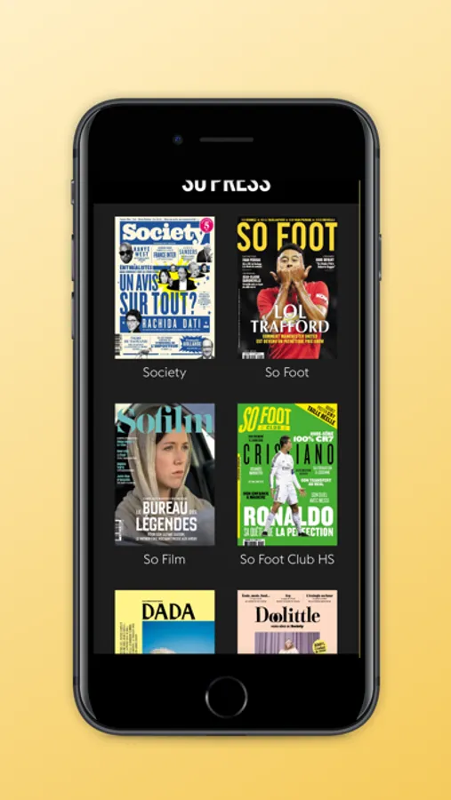 Le kiosque digital So Press regroupe tous les titres (So Foot, Society, Sofilm, Pédale!, Tampon!, Doolittle, So Foot Club…) de ce jeune groupe libre et indépendant dont la ligne éditoriale est de raconter des histoires en s’attachant à l’humain, avec une prise de distance par rapport aux faits. Le récit est privilégié, les papiers longs alternent avec des formats courts en entrée et fin de magazine pour un meilleur équilibre.