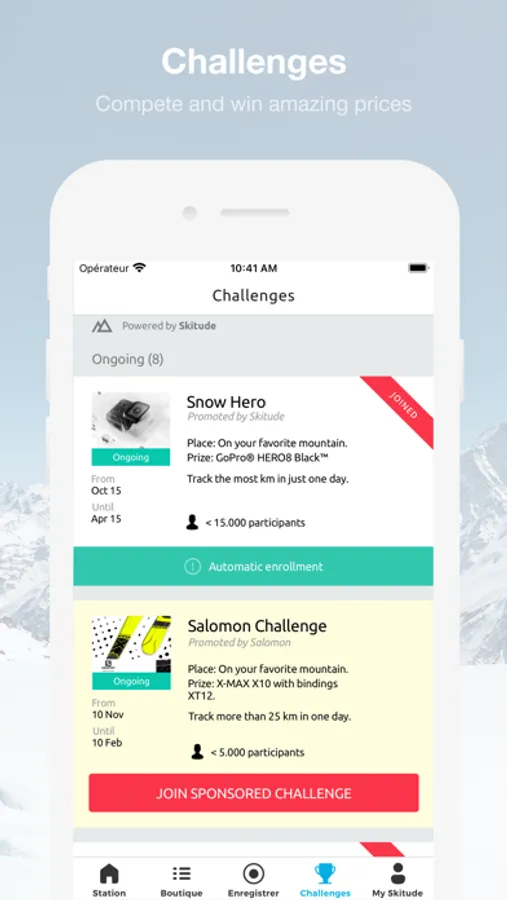 Set up your Skitude profile to track your activities using the GPS tracker. Find out where you are in the season's rankings and try to complete the challenges to be in with a chance of winning great prizes.