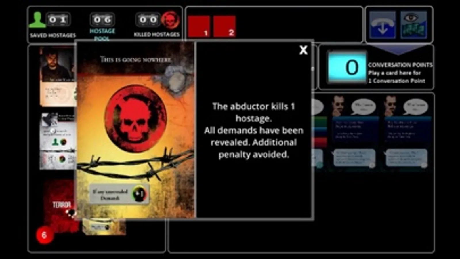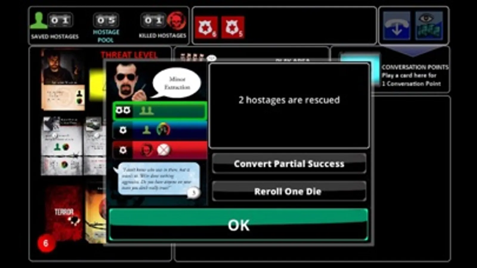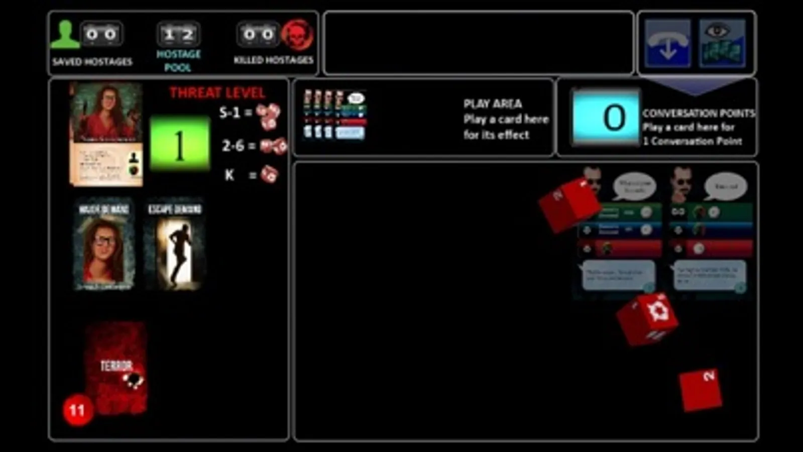 Each turn in the game represents a conversation between you and the hostage taker. You'll play cards and roll dice to increase conversation points, decrease the threat level, and release hostages. Hostage Negotiator uses a unique "hand-building" mechanism that puts cards you purchase directly in your hand for next turn rather than leaving you wondering when the cards will show up like in deck-building games.