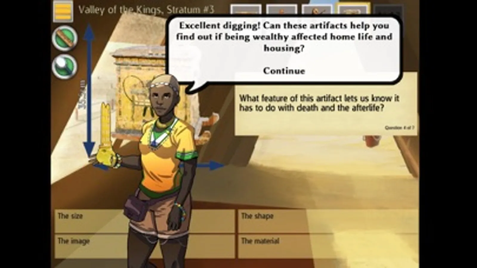 Players can explore the sites in any order; progress is recorded in journals that log collected artifacts, field notes and achievements. Throughout the game, players use skills to analyze and make connections. They carefully deduce the facts about each area, stratum by stratum and artifact by artifact. At each location, players make meaning of how artifacts were used through a series of analysis questions and reports that require players to make connections, read closely and consider the historical context of the primary source artifacts. Finally, players see each site come alive as artifacts populate an historically accurate image of Egyptian life.