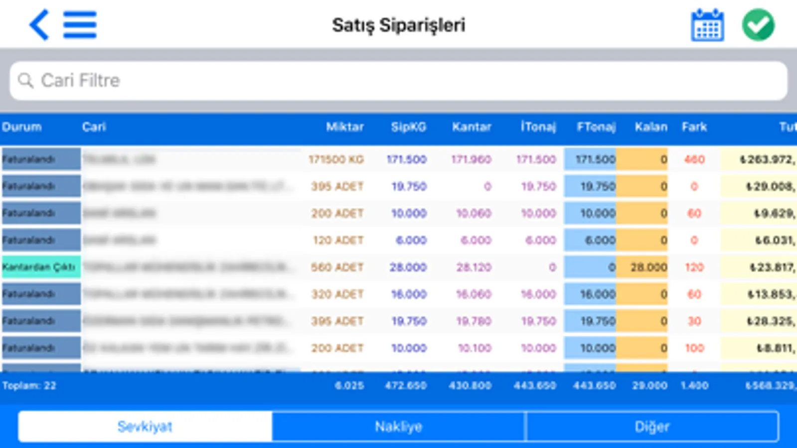Sevkiyat menüsünde anlık kantar hareketlerini ve siparişleri gelişmiş filtre seçenekleri ile görebilirsiniz.