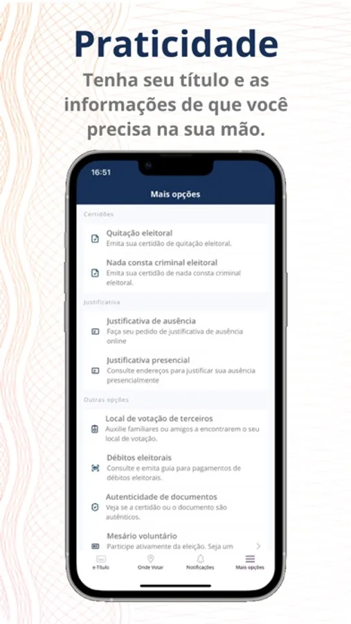 O e-título é a via digital do título de eleitor. Com ele, é possível ter acesso fácil e rápido às informações pessoais na Justiça Eleitoral. A nova versão, além de manter o fornecimento de certidão de quitação eleitoral e de crimes eleitorais, tem novidades: seus dados passam a ser protegidos por senha, além de permitir consultar débitos eleitorais e se cadastrar como mesário voluntário.