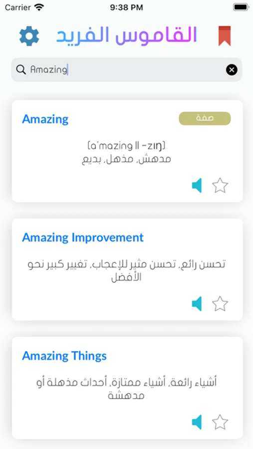 يمكنك نطق الكلمات الانجليزية والعربية عند الضغط على ايقونة الصوت