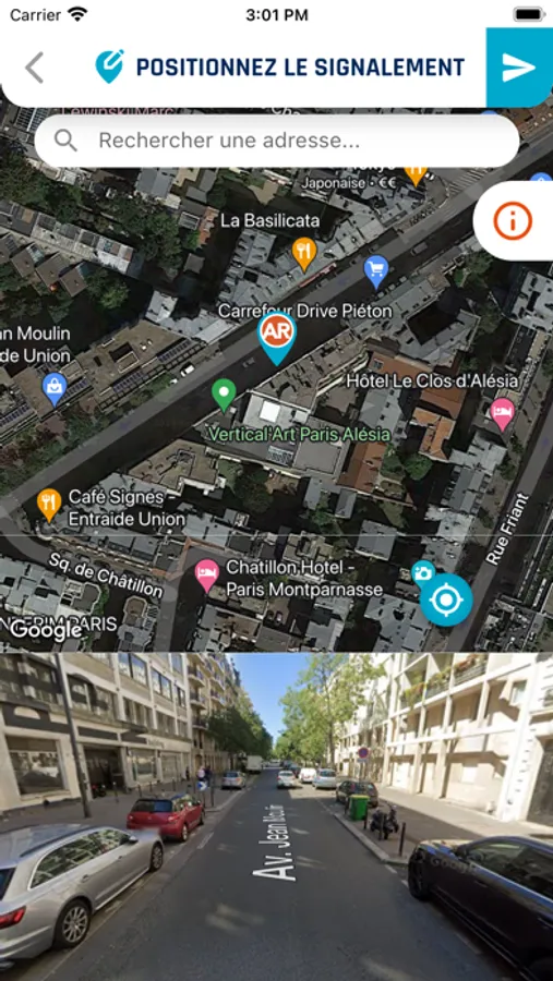 Étape 1 : En voiture, l'appli téléchargée sur votre smartphone permet de géolocaliser la zone dangereuse que vous venez de détecter.