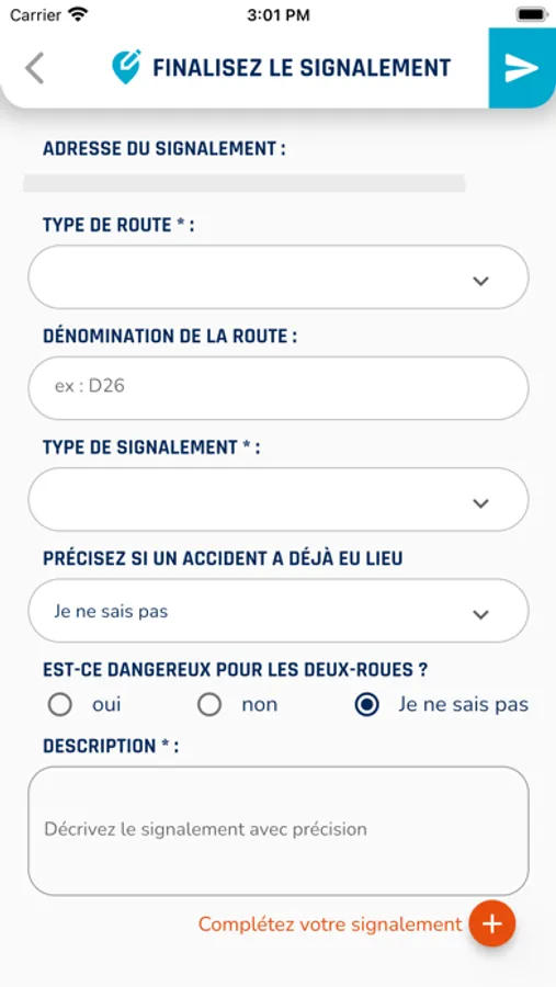 Étape 2 : Votre signalement est fait. Le reste de la description de la zone dangereuse (nature du défaut, photo à télécharger) peut être fait sur téléphone ou ordinateur (www.activroute.org). Le tout, de manière très intuitive : notre formulaire unique est ultra simplifié, adapté à tous les types de signalement.