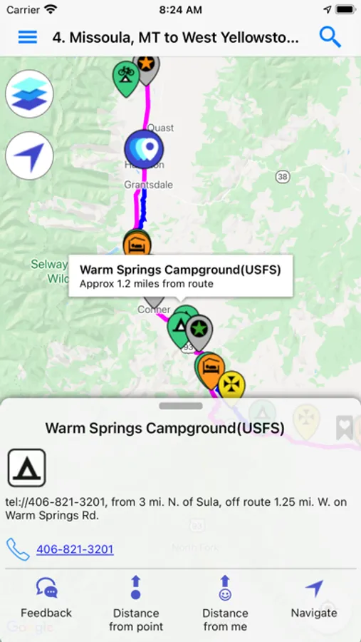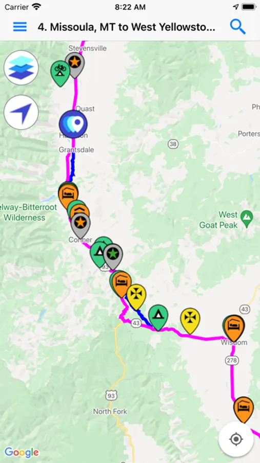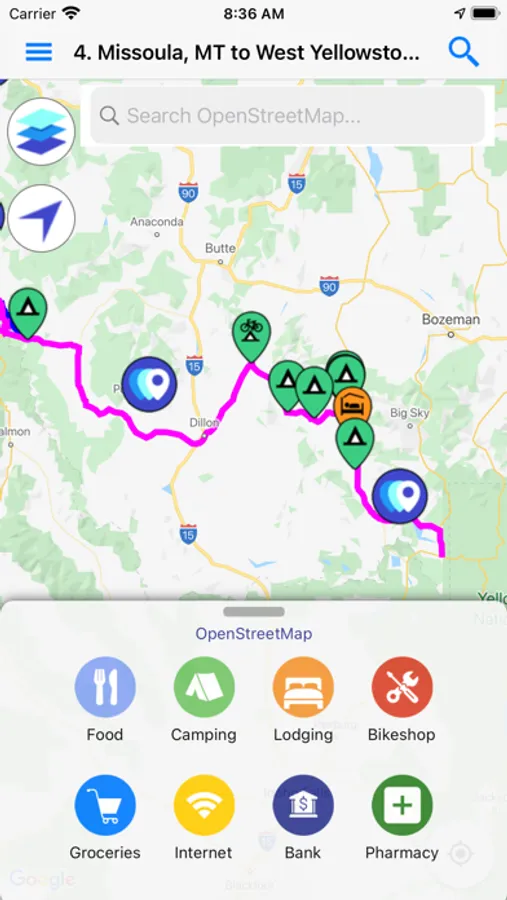 One tap to call ahead for a campsite, check lodging availability or connect with a nearby bike shop. Use embedded OpenStreetMap search for even more services.