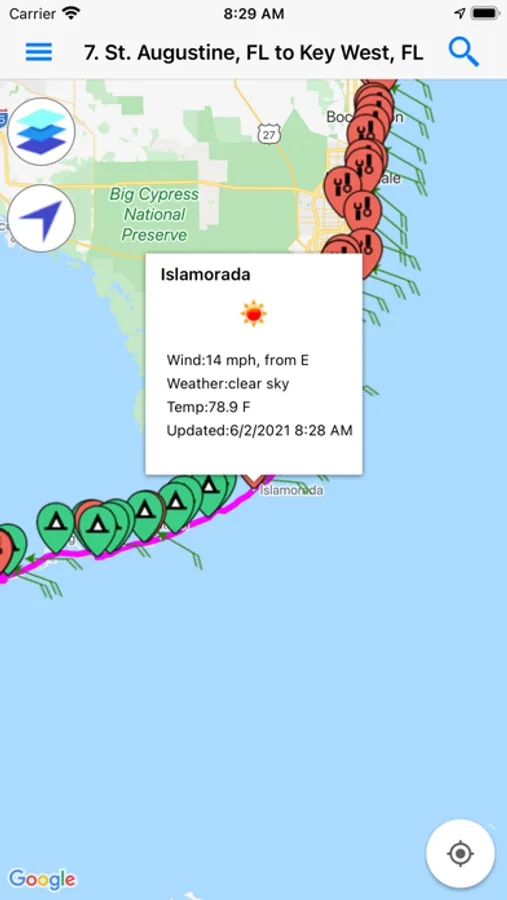 The app includes wind and weather data along the routes and severe weather warnings that include thunderstorm, flood, and fire information.