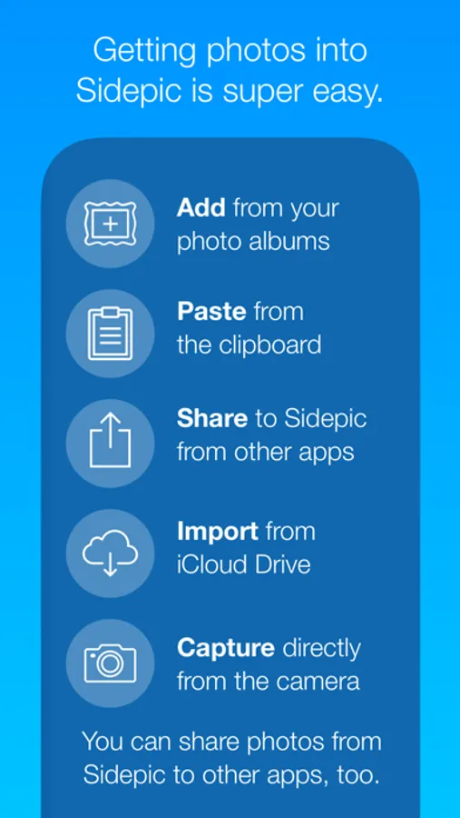 It’s easy and convenient to get photos into Sidepic: