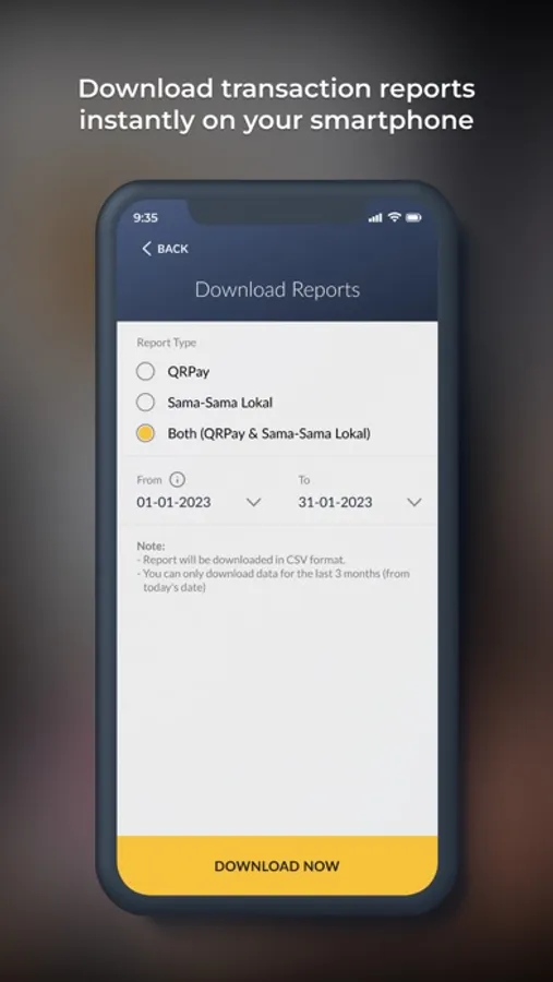 - Download transaction reports from all your QR payments / Sama-Sama Lokal outlets