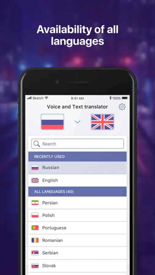 In the mode of voice translation the application supports the following languages: English, Arabic, Bulgarian, Dutch, Greek, Danish, Indonesian, Icelandic, Spanish, Italian, Catalan, Chinese, Korean, Malay, German, Norwegian, Polish, Portuguese, Romanian, Russian, Serbian, Slovak, Slovenian, Thai, Turkish, Ukrainian, Filipino, Finnish, French, Hindi, Czech, Swedish, Japanese.