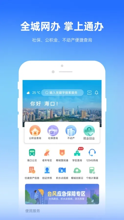 椰城市民云是海口市以市民为中心的一站式“互联网+”公共服务平台,市民通过椰城市民云这一个入口,就能“一号通行”,畅享所有政府服务。