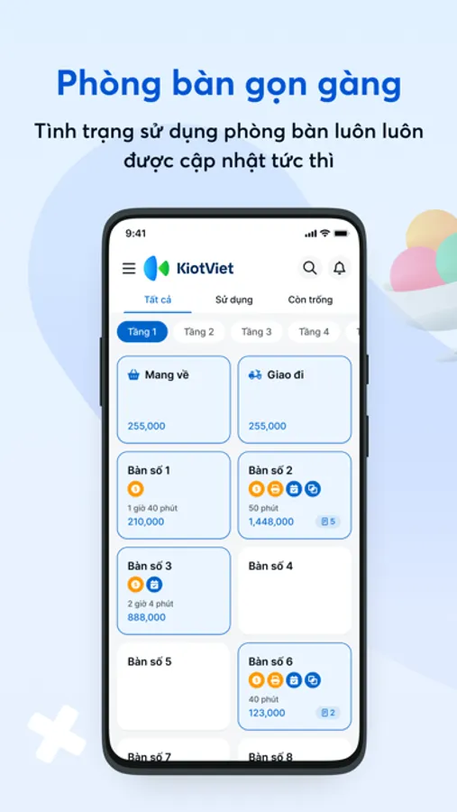 Giúp bạn kiểm soát việc đặt phòng/ bàn, nắm bắt chi tiết thông tin từng phòng/bàn trong quán đang sử dụng hay còn trống, số lượng khách mỗi phòng/ bàn là bao nhiêu, danh sách món ăn đã gọi tại từng phòng/ bàn và tình trạng chế biến, phục vụ của các phòng/bàn.