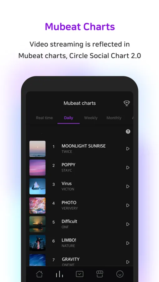 Help your favorite artist top the charts by streaming their videos. The video views are reflected on the Real time Mubeat Chart and the Gaon Social Chart 2.0.