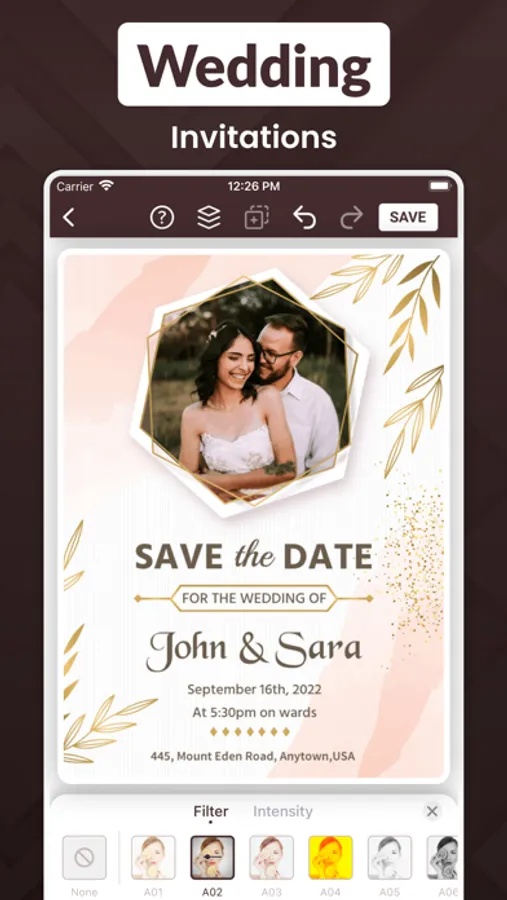 You can make wedding invites just the way you want by using wedding invitation templates. Start off your design process by exploring the wedding card templates in the library. Choose one that fits your design priorities. Tap on it to enter the editor screen. Alter the text, fonts, and graphics as per your need. Upload your own photo or choose from our library and add it to your wedding invitation template to make it extra special. Design your wedding invitation with our easy-to-use wedding invitation maker.