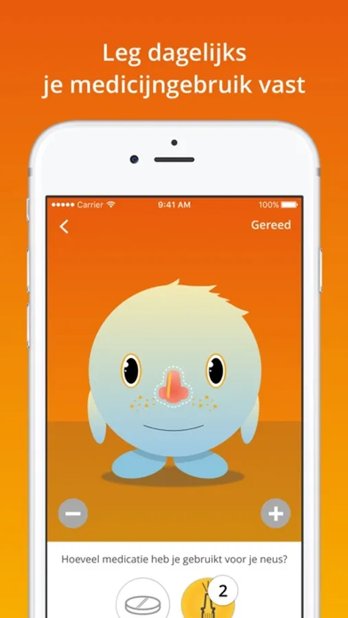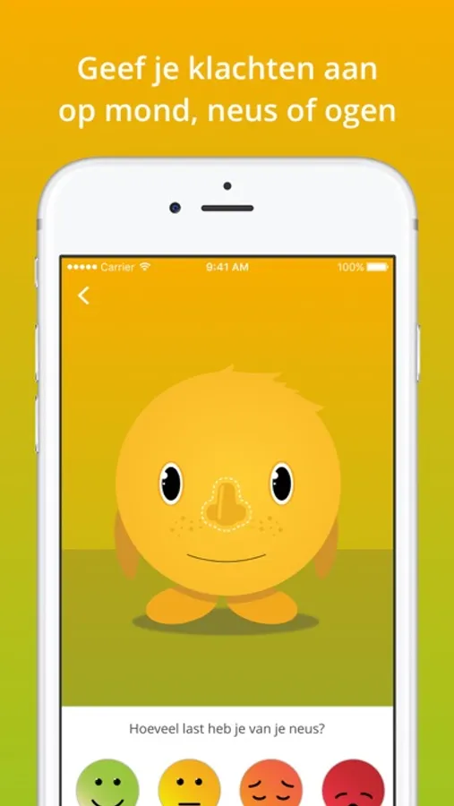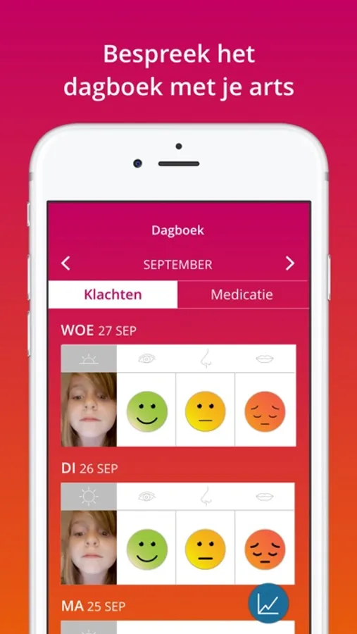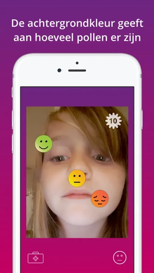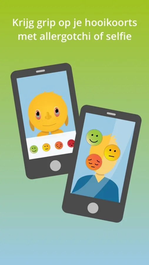 Klachten houd je bij voor je ogen, neus en mond. Tik bijvoorbeeld op je ogen (selfie) of de ogen van allergotchi en kies een smiley. Heb je veel last? Kies een verdrietige smiley. Heb je geen last? Kies dan een blije smiley. Zo kun je per dag bijhouden hoe je je voelt.