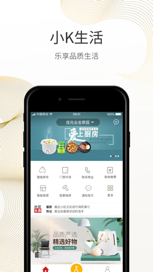 “小K生活”是由佳兆业物业集团为佳兆业业主倾力打造的一站式智慧社区服务平台,集物业基础服务(账单缴费/智能停车/报事报修/智能门禁)、生活服务、管家严选,K会员服务、社区金融、邻里社交等功能于一体,致力于为“佳人”提供多元化的一站式智慧社区生活服务平台。