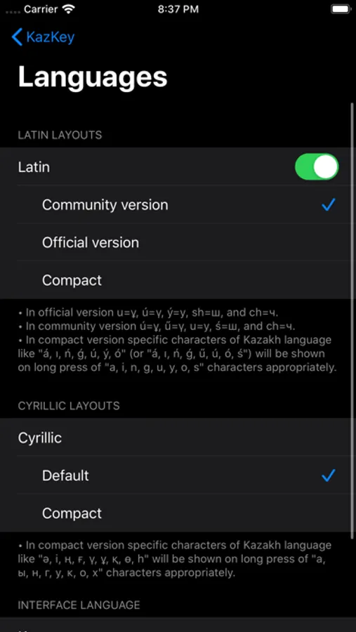 - Compact ЙЦУКЕН layout (specific letters of the Kazakh alphabet will be hidden under the letters of the Russian alphabet and are shown with a long press on them)