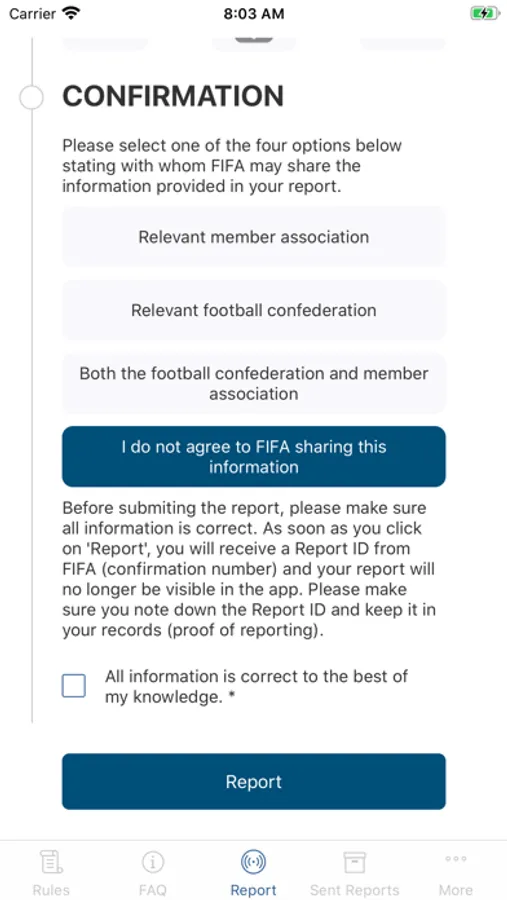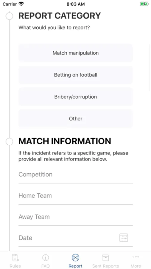 The mobile app has been designed to provide a confidential and secure communication channel between FIFA and the end user. The core functionality of the app is a simple form which needs to be completed by those teams, players and match officials with concerning information about betting related fraud, match-fixing or breaches to the rules affecting the integrity of football. Evidence can be submitted using the audio and camera features to support with an investigation. Teams, players and match officials can find the FIFA Disciplinary Code and the FIFA Code of Ethics here to ensure they understand the rules and also have access to the FIFA news feed as well as some useful FAQs regarding the app itself.