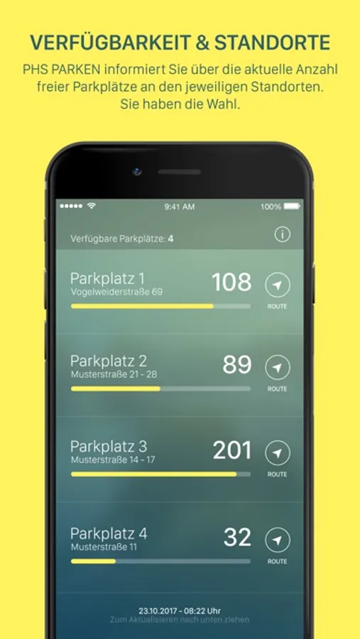 Mit der neuen App "PHS Parken" können Sie ganz entspannt schon beim Wegfahren prüfen, wo wieviele Parkplätze verfügbar sind. Mit einbezogen sind alle Mitarbeiterparkplätze mit Ausnahme der Tiefgaragen. Durch kurze Aktualisierungszeiten sind Sie auf Ihrer Anfahrt zum Porschehof stets auf dem aktuellen Stand!