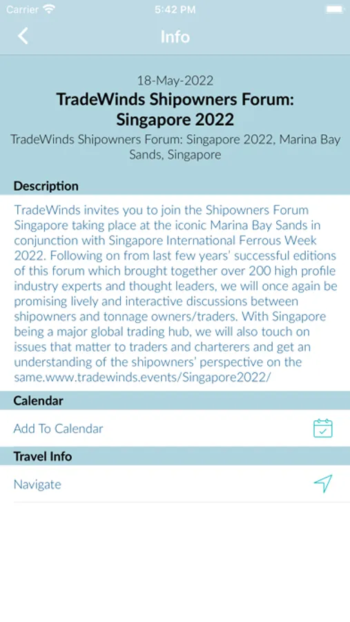 Maximise your attendance at TradeWinds’ Events by using the free app. Features - Information: event description, Add to calendar and location information - Engagement & interaction: list of attendees, Add to Contact list functionality - Session timing, location and speakers - Communication – push notifications, messaging & inbox - Speaker bios - Online Q&A function for posting questions to the panel in real time ABOUT TradeWinds Events TradeWinds Events is the conference arm of shipping news provider TradeWinds (www.tradewindsnews.com). We help move business forward through information exchange, stimulating fresh thinking and professional networking. We produce lively, independent and interactive conferences covering a wide range of maritime sectors. Each conference agenda is carefully designed to tackle the most topical and often controversial subjects