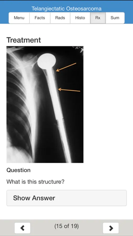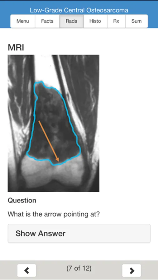 Orthopaedic surgery residents often struggle to identify time-saving study resources to prepare for board and in-service examinations. To address this concern, the University of Michigan Department of Orthopaedic Surgery developed this interactive educational tool focusing on the most common and testable topics related to Orthopaedic Oncology. This app highlights the important aspects of Benign and Malignant Bone and Soft Tissue Tumors with emphasis on radiographic and histological characteristics with appropriate and up-to-date treatment options. Self-assessment multiple choice questions are included to aid in exam preparation.