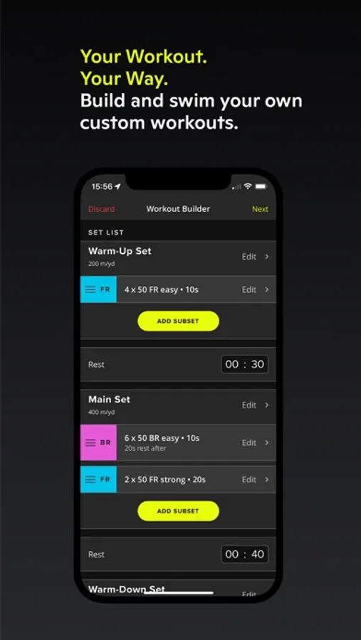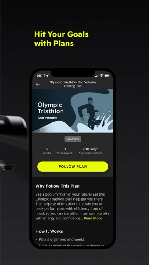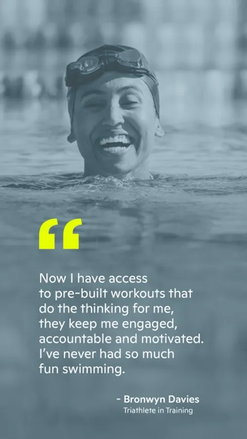 1. ALL YOUR SWIM TRAINING. Choose between Plans and Workouts based on your swim goals. Work through a Plan structured to help you improve your swimming skills or swim an individual guided workout. You can also load your own workouts through our custom workout builder.