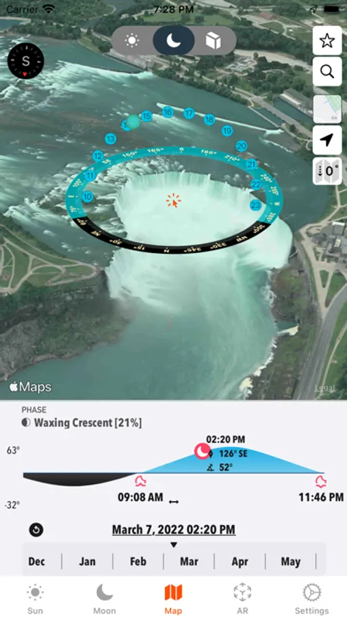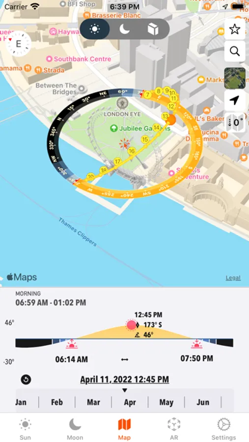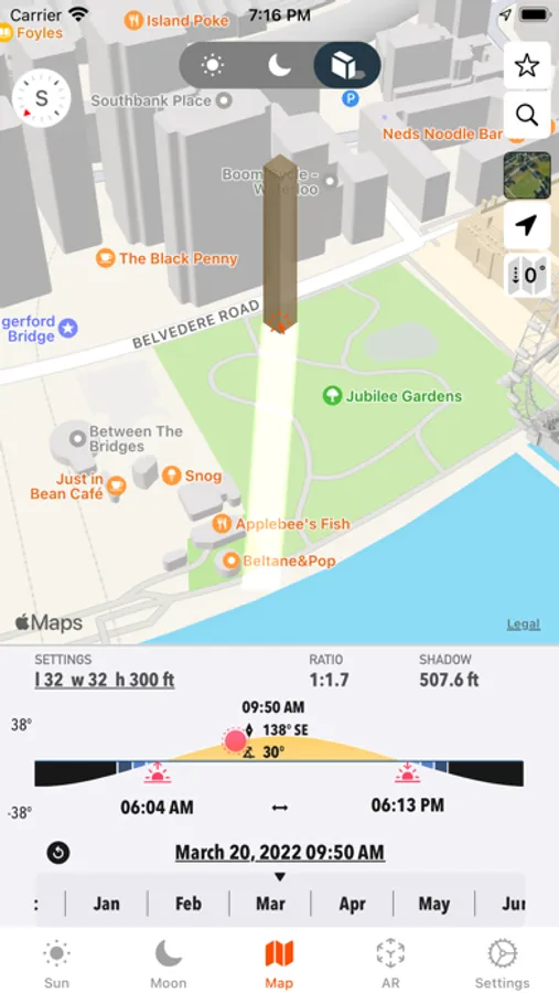 Position a customizable 3D object on the map to have the app simulate its shadow at any time of year.