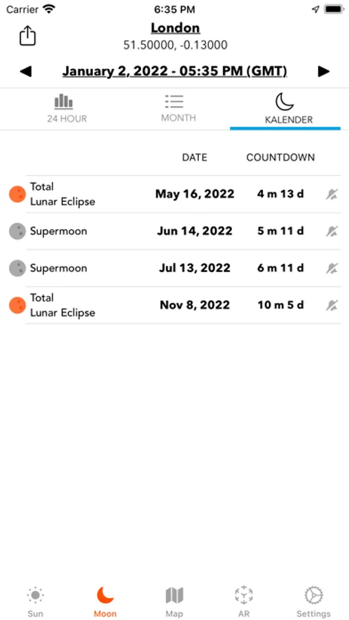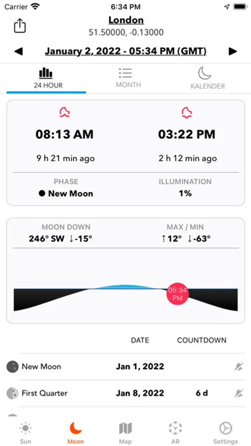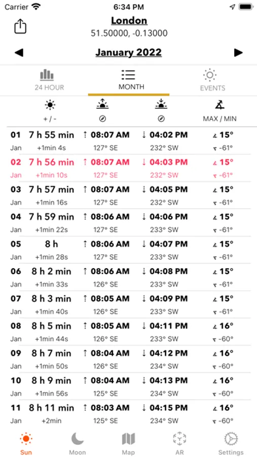 The free version of the app shows all information about solar and lunar positions for your current time and location only.