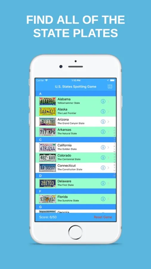 Find The Plates is a fun but simple game that lets you keep track of all of the state license plates that you've seen!