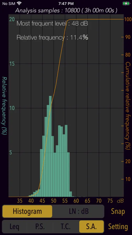 - Histogram : Displays all detected sound level distribution as a percentage.