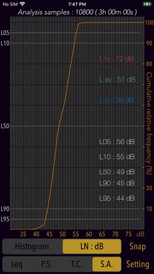 - Percentile Level (LN:dB): Display the levels of L05 / L10 / L50 / L90 / L95 on the percentile level graph.