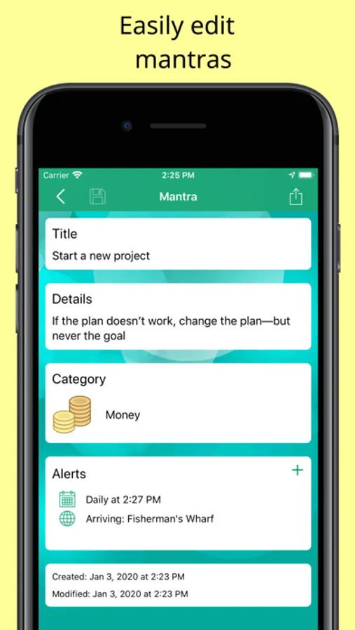 The Personal Mantra app allows you to create customized mantras, categorize them, and schedule the mantras to send you a reminder when they would be most beneficial.