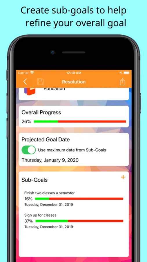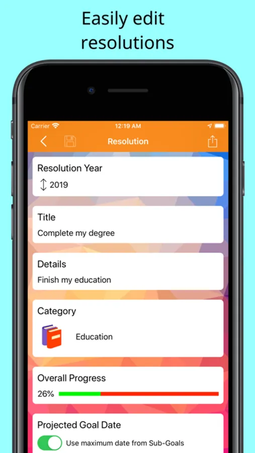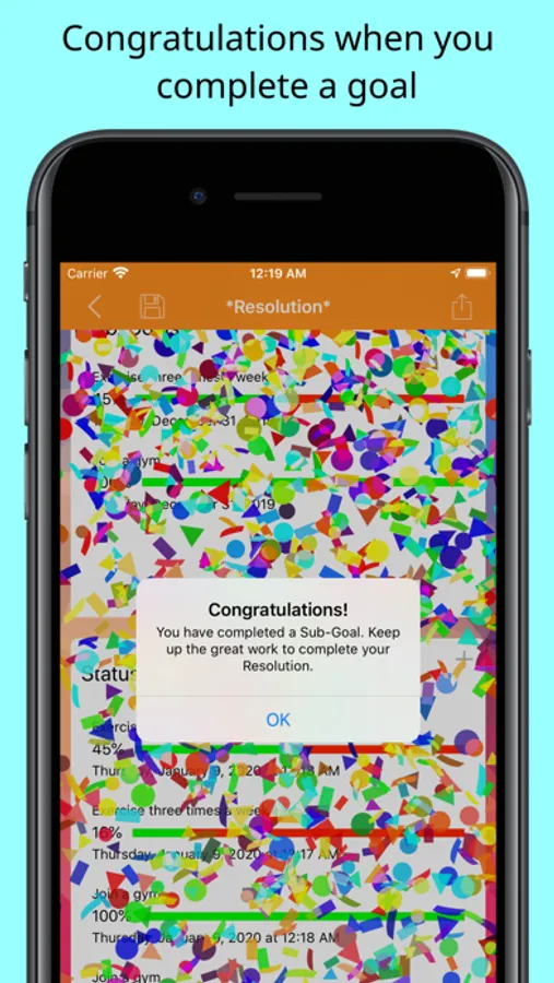 A New Year’s resolution is an opportunity for you to define a specific, measurable and attainable achievement. This resolution may be to create a new habit, accomplish a goal, or make an improvement in your life.The most common reason for not achieving a resolution is not documenting them and tracking progress to their completion. Most New Year’s resolutions are forgotten before the end of January. The Yearly Resolutions app also lets you set up sub-goals. This allows you to break down your resolution into manageable steps. This app enables you to track your progress for each sub-goal and encourages you to reach your overall resolution.We hope you find this app helpful in supporting your day-to-day activities and welcome your comments and suggestions. Contact Us!Features:- Create personalized New Year’s resolutions- Choose from many resolution samples- Configure multiple reminders per resolution- Create location and calendar reminders- Over 1200 standard background image and color combinations- Use your own photos as the background image- Tag resolution with a personalized category image- Choose from over 50 category tags- Create multiple sub-goals per resolution- Track status and progress for the goal or sub-goal- Rebalance the importance of each goal or sub-goal- Specify the year for each New Year’s resolution= Always Free Trial =