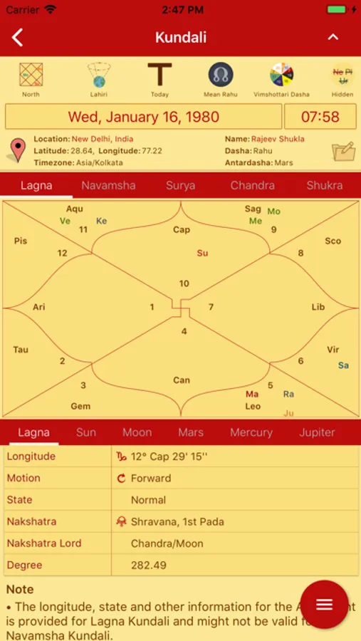 Kundali Support - Drik Panchang comes with Kundali support and it can generate Lagna Kundali for any date, time and location. For Lagna Kundali it shows detailed planetary position for Sun, Moon, Mars, Mercury, Jupiter, Venus, Saturn, Rahu, Ketu, True Rahu, True Ketu, Uranus, Neptune and Pluto. The Kundali can be drawn either in North Indian or South Indian chart format.
