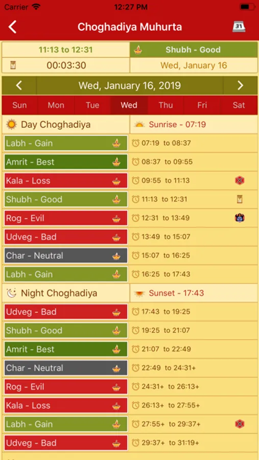 Muhurta Table - Drik Panchang comes with day and night Choghadiya, Shubh Horai and Udaya Lagna. Each running Muhurta is shown with count down timer.