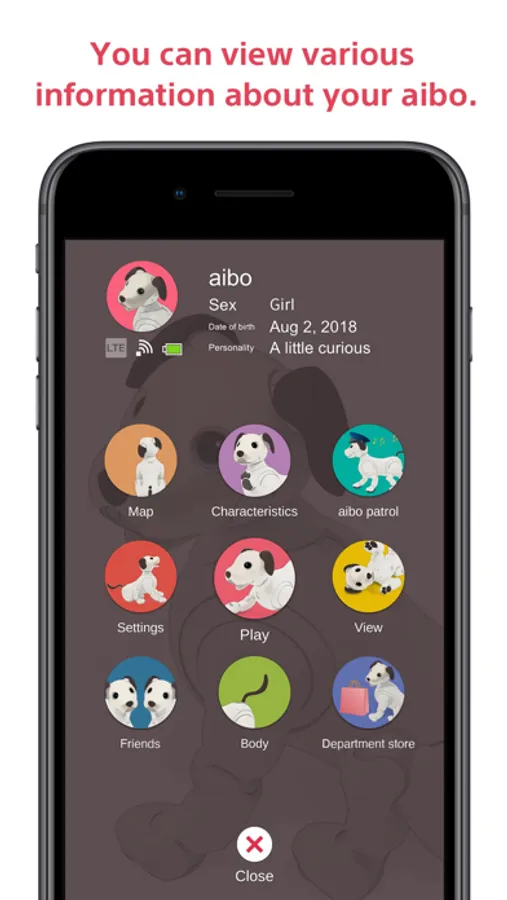 In addition to accessing system settings and owner information, other features include "aibo Photos," which lets users view any pictures taken, and a feature to "Play" with a virtual aibo inside the app.