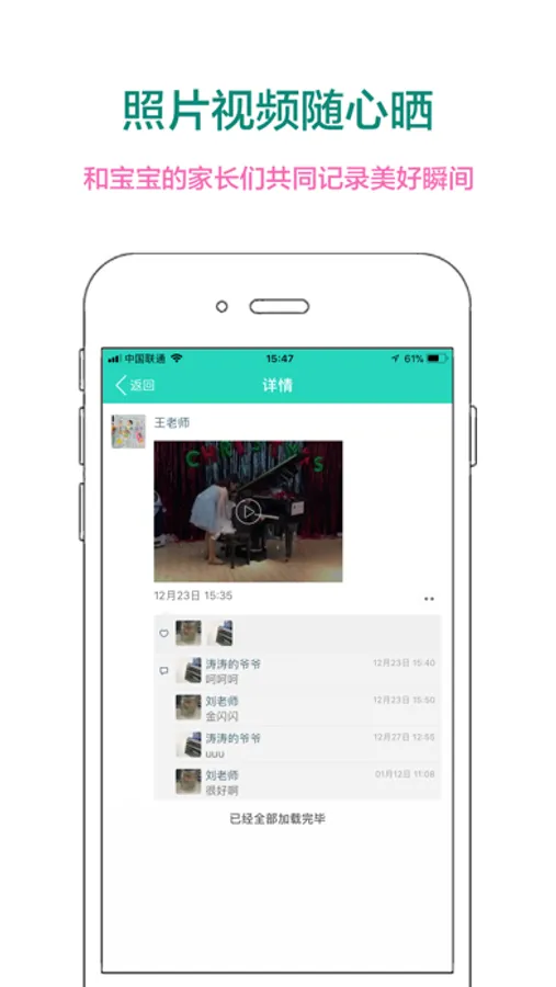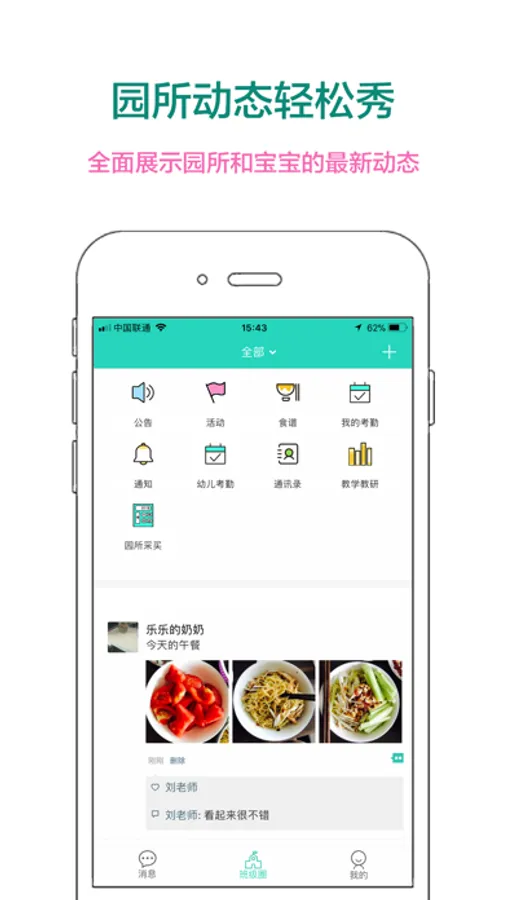 食谱、公告、活动、班级动态一键发布,家长们都能看见,还可以转发哦~