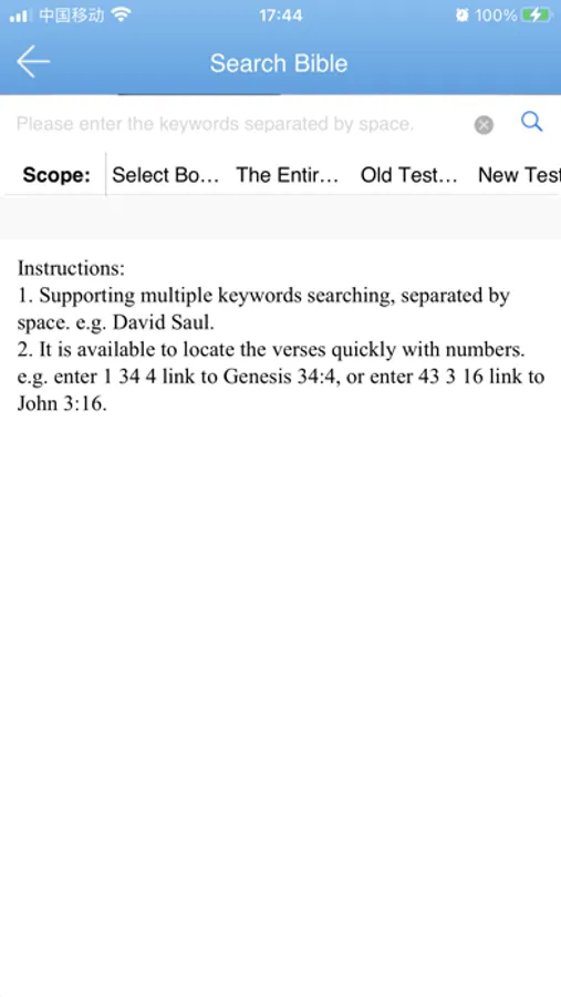4. Full Bible text retrieval: It supports multiple keywords search with each keyword separated by space and with optional retrieval range. There is also a hidden function that helps quickly locate some verse, e.g., 1 34 4 standing for Genesis 34: 4.