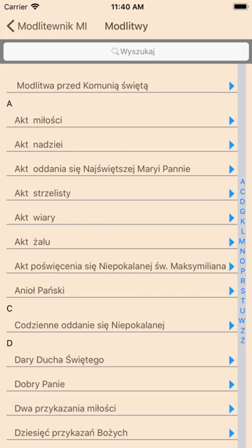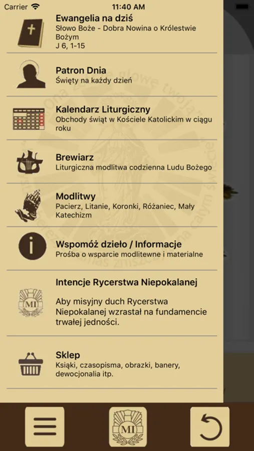 Aplikacja Modlitewnik MI – zawiera teksty modlitw dedykowanych dla Rycerstwa Niepokalanej – Stowarzyszenia założonego przez św. Maksymiliana Marię Kolbego w 1917 r. Zawiera komplet modlitw i rozważań wspomagających formację duchową Rycerstwa Niepokalanej. Ponadto, aplikacja zawiera, informacje o Patronie Dnia, intencjach miesięcznych MI a także kalendarz liturgiczny.