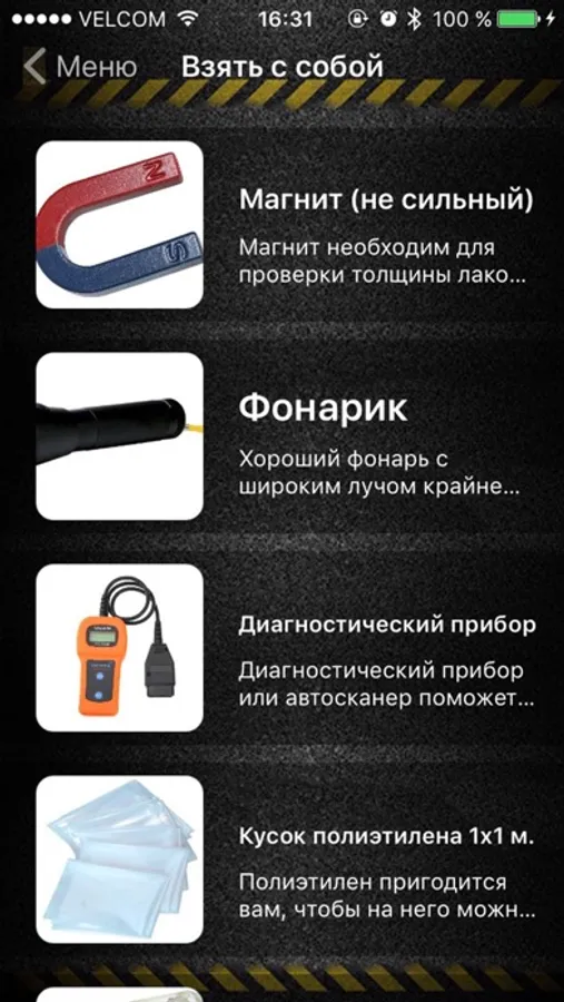 Это приложение создано для тех, кто хочет сам проверить свой будущий автомобиль. Оно простое, доступное и очень легкое в использовании. Для проверки машины не нужны специальные знания и навыки - достаточно просто пройти каждый пункт приложения и выбрать вариант ответа. Результатом проверки станет общая оценка автомобиля с указанием потенциальных перспектив его использования.