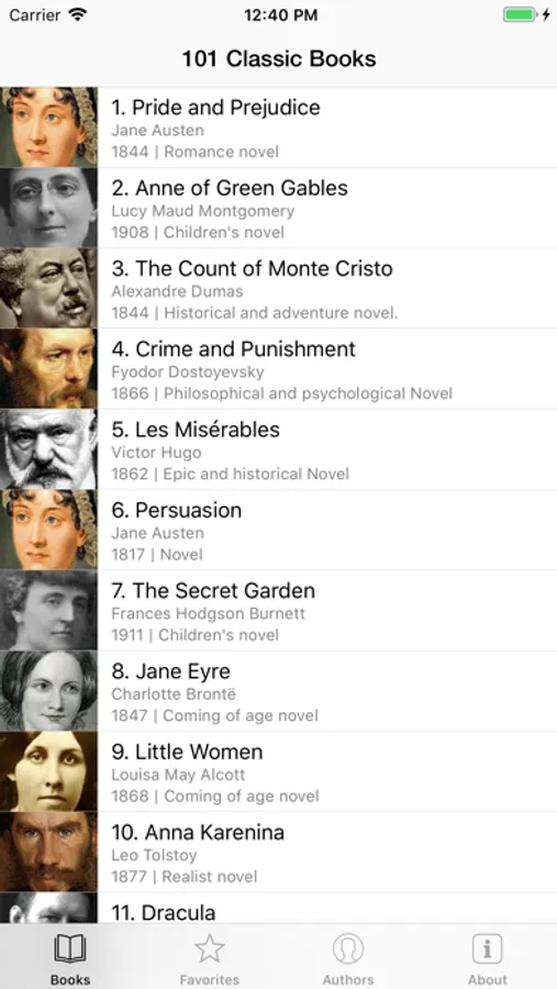 A collection of some of the most famous books in American, English and international literature: novels, poetry, plays, tales, philosophy. The books were selected by analyzing polls and reader ratings.