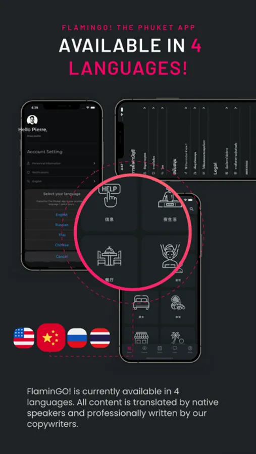 The FlaminGO! App is available in English, Chinese, Russian and Thai, so everyone who is visiting, or making holidays in Phuket, can be sure to understand the travel guide at their own terms.