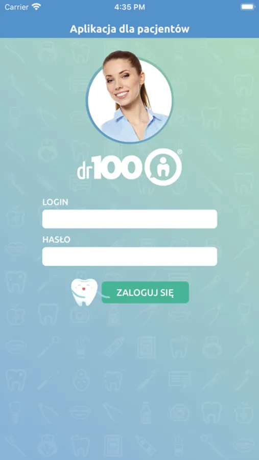 Aby korzystać z aplikacji, pacjent musi mieć konto w programie dr100, założone przez lekarza/placówkę. Konto jest powiązane z adresem e-mail pacjenta i aktywowane za jego pośrednictwem. Na podany adres pacjent otrzymuje wiadomość z unikalnym identyfikatorem do logowania oraz linkiem aktywacyjnym. Po kliknięciu w link ustawia swoje hasło do konta. Od tej pory może już logować się w aplikacji mobilnej.