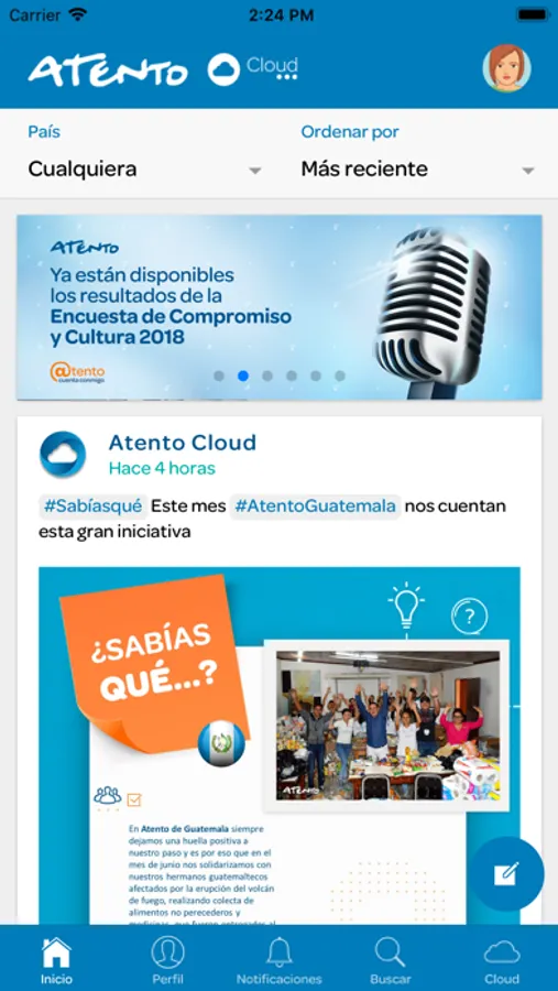 Aplicación oficial para la red social interna Atento Cloud de la empresa Atento, donde los empleados pueden compartir sus experiencias y contactar con compañeros de otros países.