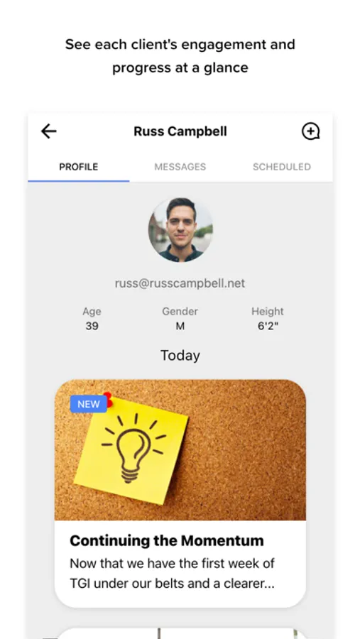 See what each client is tracking for you, and trends in their progress at a glance, so you can provide personalized, in-context, and actionable feedback each time you message a client.